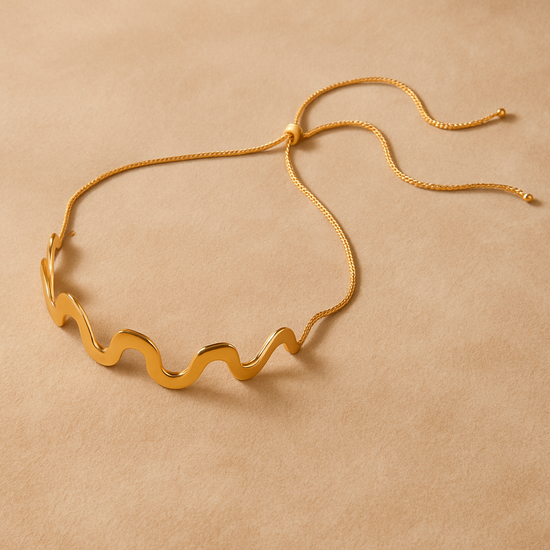 A sculptural gold-plated choker featuring a smooth, flowing wave design that rests elegantly along the neckline. Minimal yet expressive, its fluid form adds a modern statement while remaining effortlessly refined—perfect for elevating both everyday looks and evening styles.