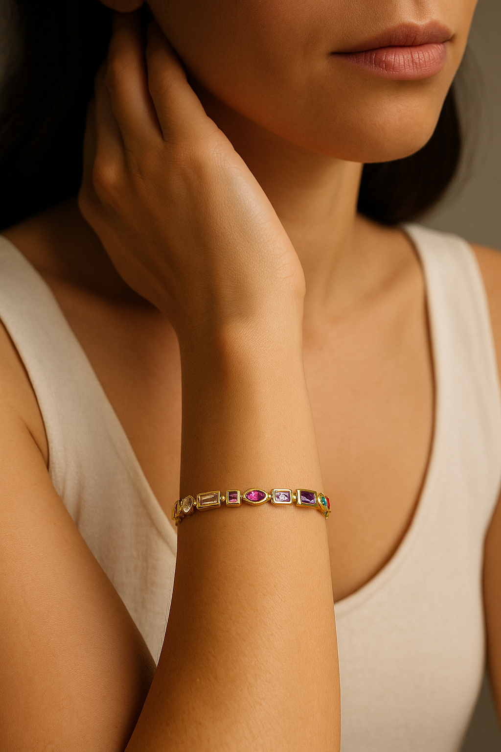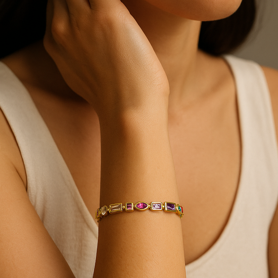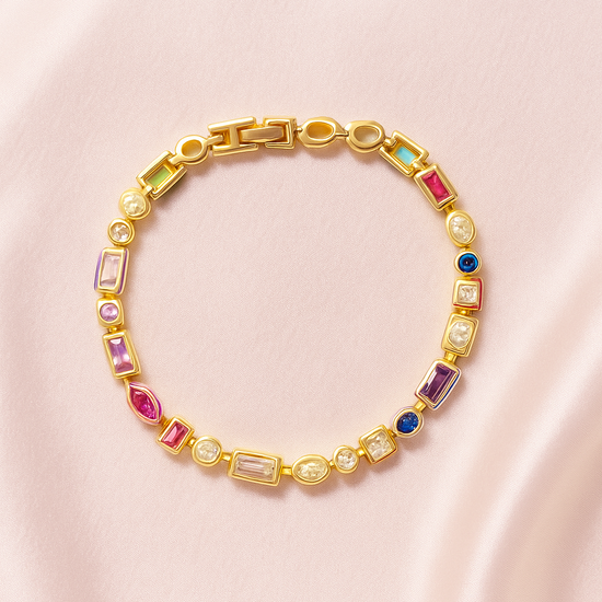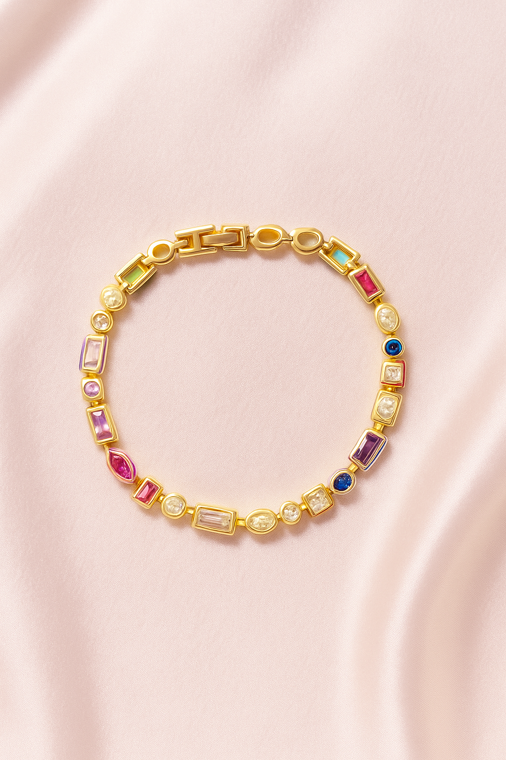 A radiant gold-plated bracelet set with a harmonious mix of vibrant gemstones in refined geometric cuts. Designed to capture light and color from every angle, it adds a graceful touch of individuality and modern elegance to any look.