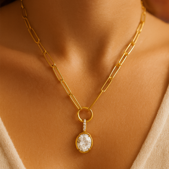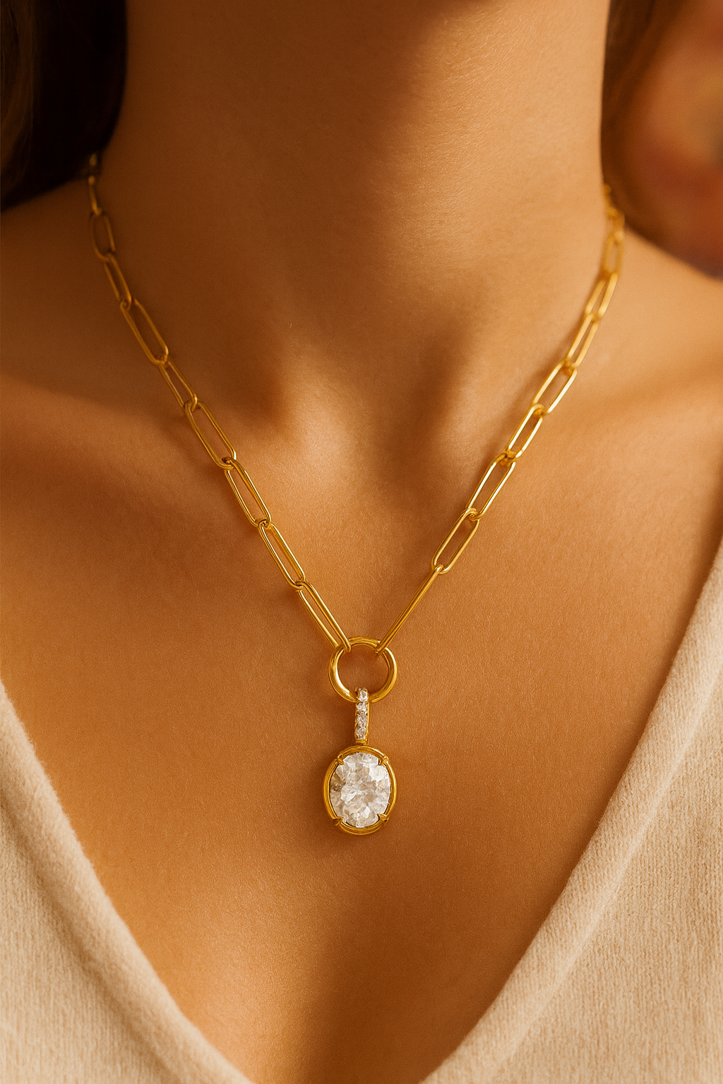 A refined gold-plated chain featuring elongated links and a radiant oval crystal pendant. Designed to catch the light with every movement, this necklace blends modern elegance with timeless charm—perfect for elevating both everyday and evening looks.
