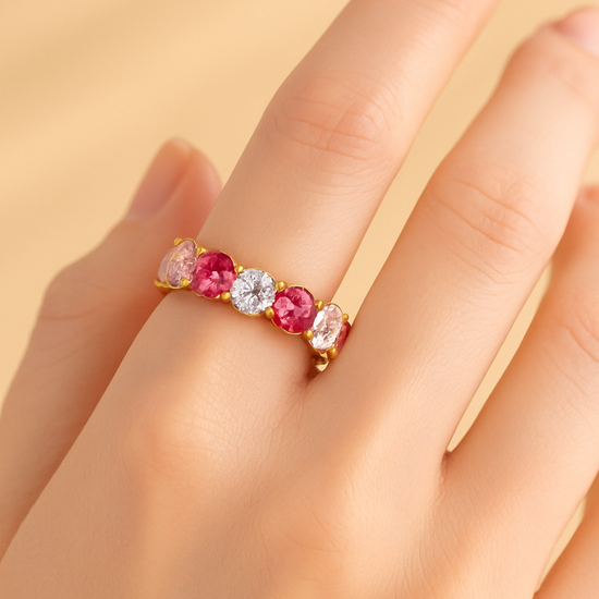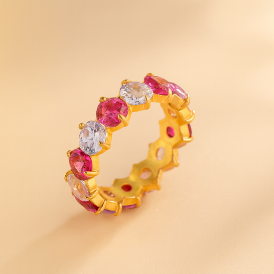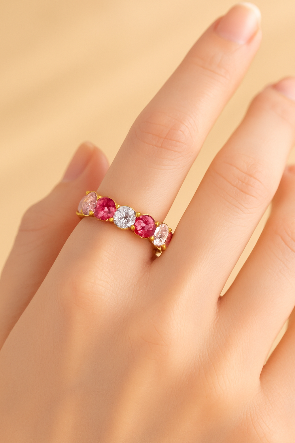 A luminous gold-plated ring featuring an elegant alternation of soft blush and clear oval-cut stones. Refined yet expressive, it captures light beautifully, creating a harmonious balance of color and sparkle for a timeless, sophisticated look.