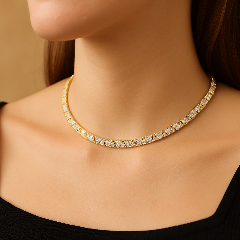 A refined gold-plated featuring a sleek row of geometric, crystal-set links that sit elegantly along the neckline. Subtle yet luminous, it delivers a polished statement with modern sophistication—perfect for both evening elegance and elevated everyday wear.