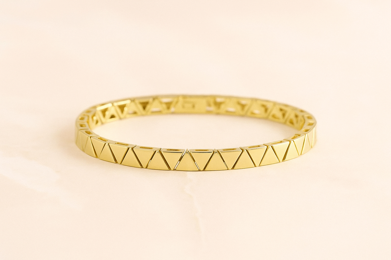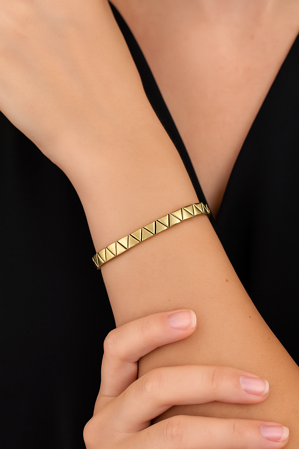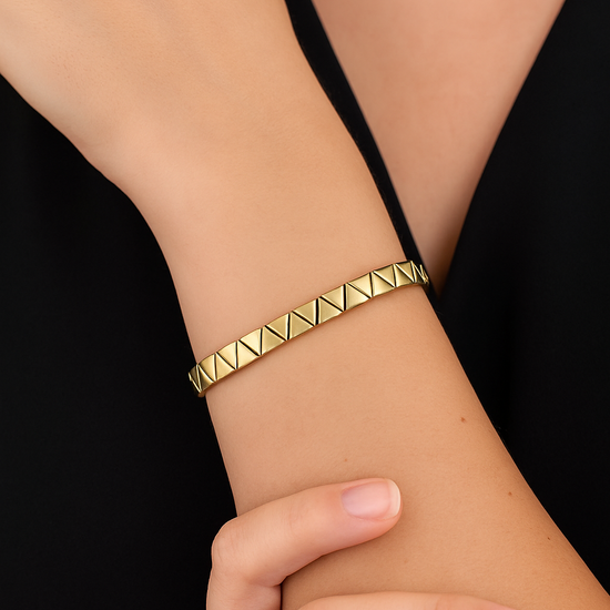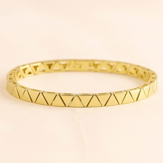 A minimalist gold-plated bracelet defined by its repeating chevron pattern, creating a subtle rhythm of light and texture. Clean, confident, and effortlessly modern, it’s a refined piece designed to elevate everyday elegance with a bold yet understated edge.