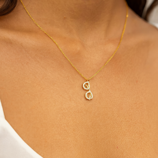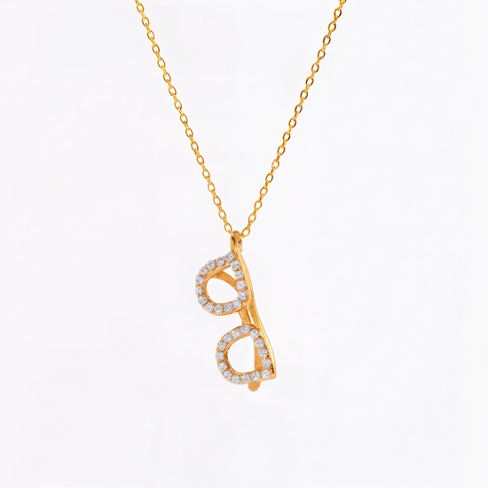 A refined gold plated pendant shaped like delicate eyeglasses, accented with shimmering stones. The Clarity Charm Necklace symbolizes vision, intelligence, and effortless elegance—designed to add a subtle sparkle and a meaningful statement to everyday wear.