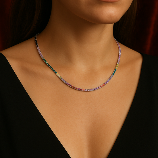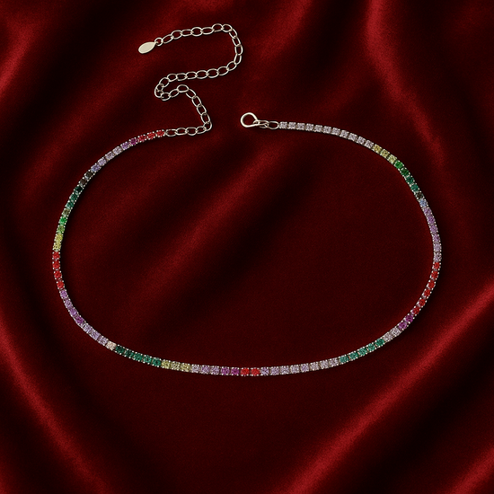 This accessory is a vibrant, multicolored gemstone necklace designed in a sleek, continuous tennis-style chain. Each stone transitions smoothly through a rainbow gradient — from fiery reds and pinks to radiant greens, yellows, blues, and purples — all set in a polished silver.