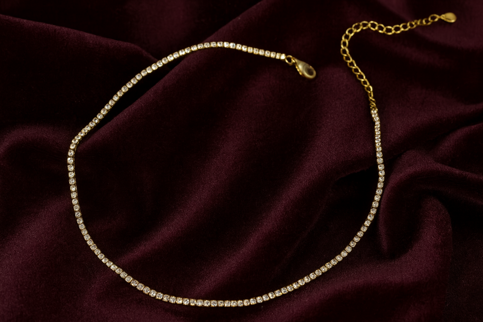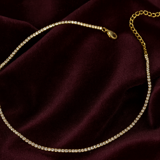 The Crystal Grace Necklace is a dazzling statement of modern simplicity. Featuring a sleek gold-white finish and rows of tiny sparkling stones.
