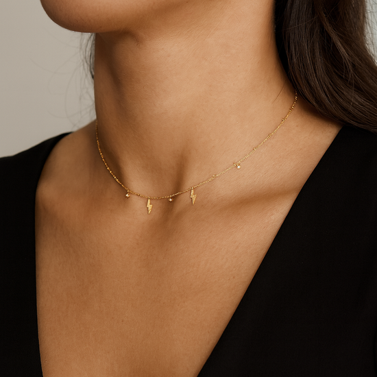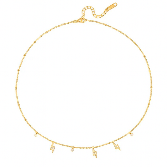 A delicate gold plated necklace accented with fine lightning bolt charms, designed to add a subtle spark of confidence and modern elegance to everyday looks.