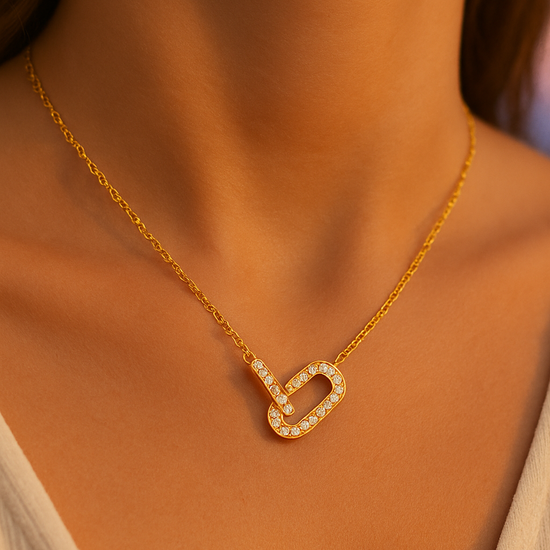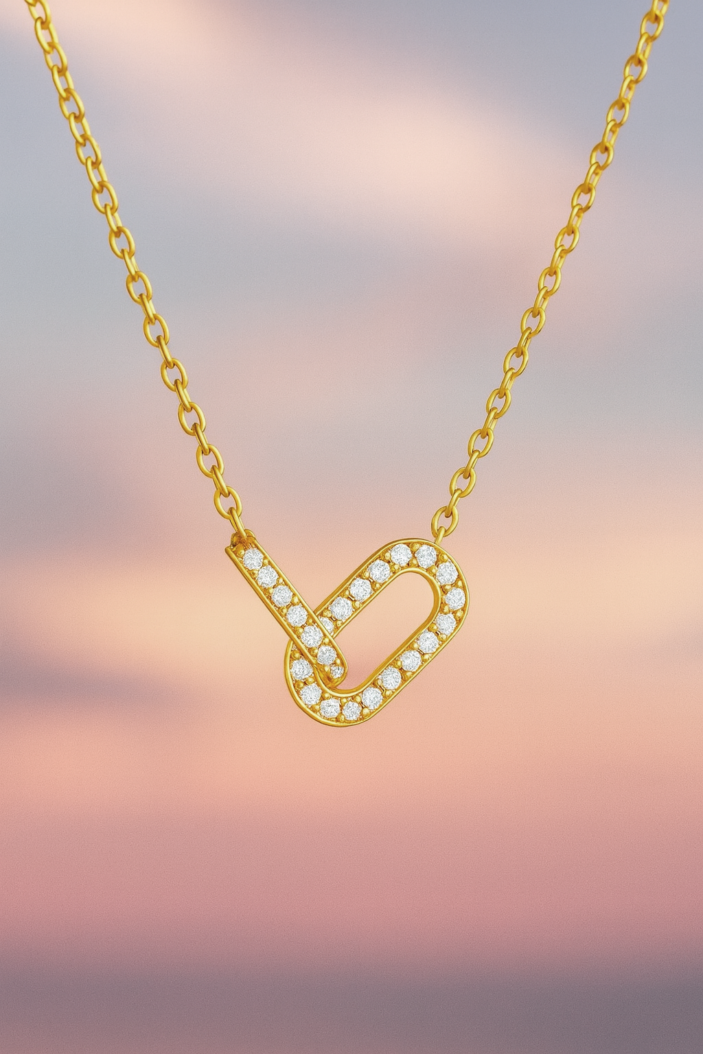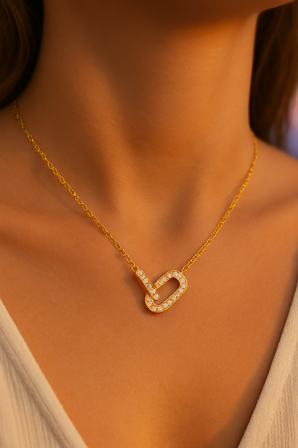 A modern gold-plated necklace featuring an intertwined heart design accented with shimmering stones. The Linked Heart Spark Necklace symbolizes connection and enduring love, blending contemporary elegance with a soft, romantic glow for everyday wear or meaningful gifting.