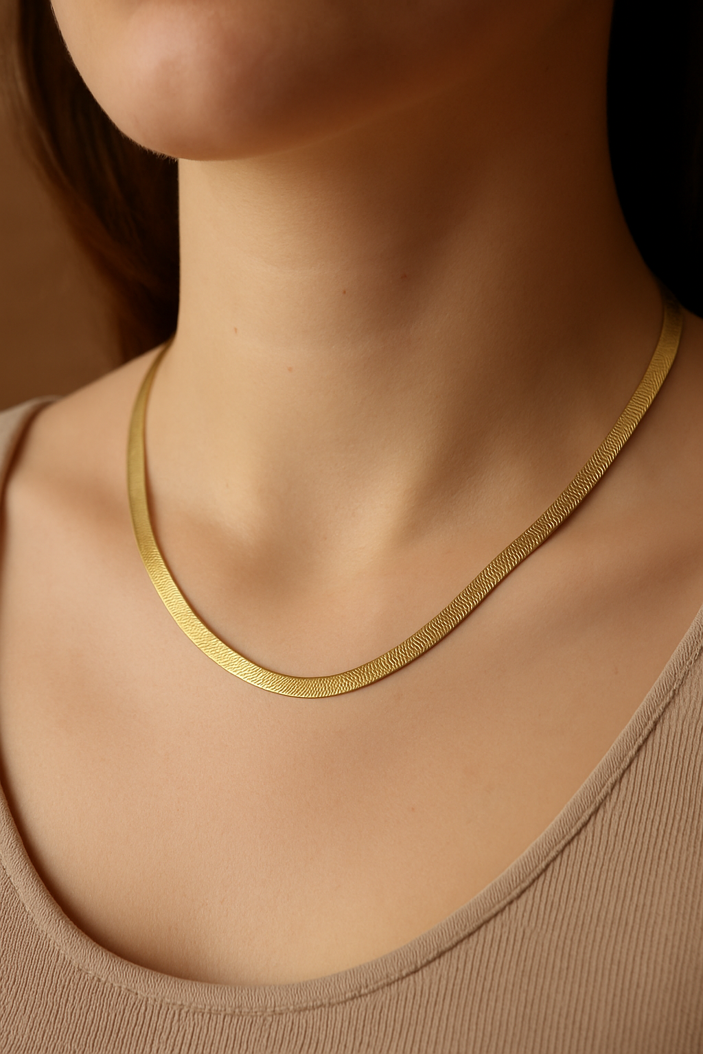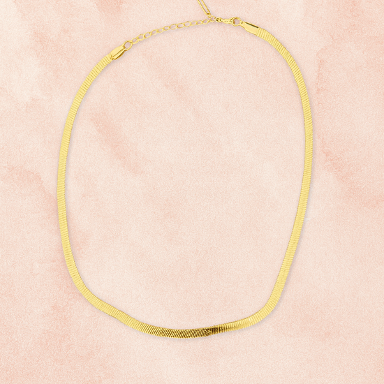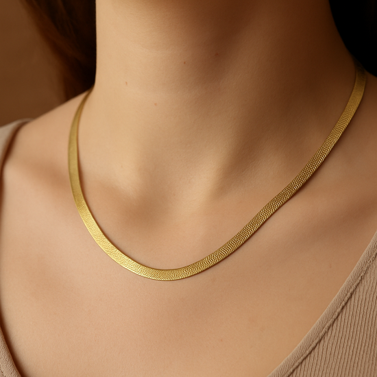 A sleek gold-plated flat chain designed to sit effortlessly along the neckline. With its smooth texture and subtle shine, the Lumi Flat Chain Necklace is a timeless essential—perfect worn alone for minimal elegance or layered for a modern, refined look.