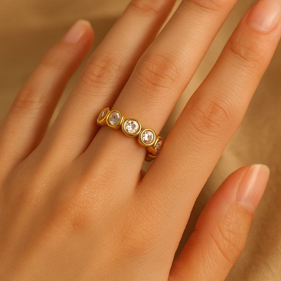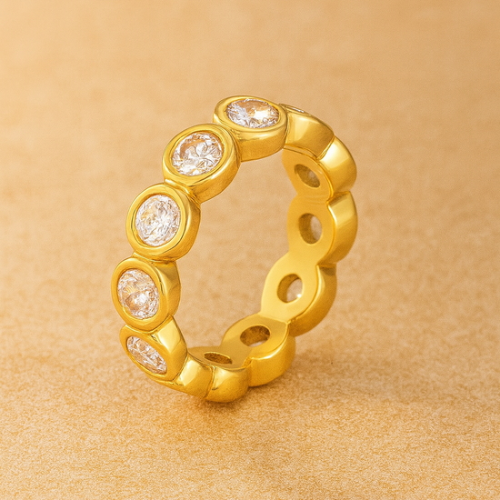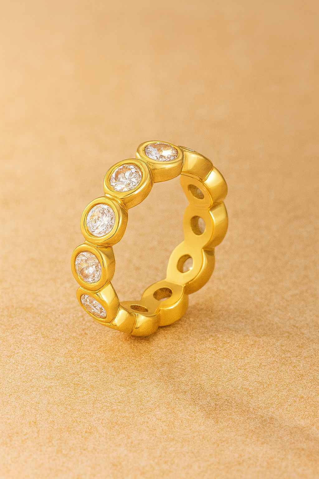 A sleek gold-plated ring featuring a continuous row of bezel-set crystals, creating a smooth, modern silhouette. Subtle yet radiant, it reflects light beautifully and offers timeless elegance for everyday wear or effortless stacking.