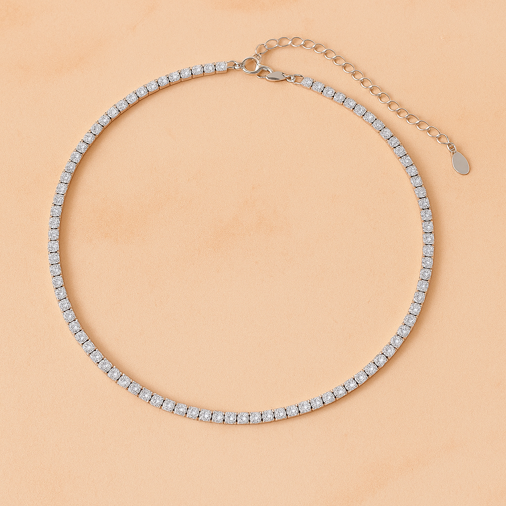 This accessory is a luxurious tennis-style necklace, featuring a continuous line of brilliant white gemstones, each set in a precisely aligned silver chain.