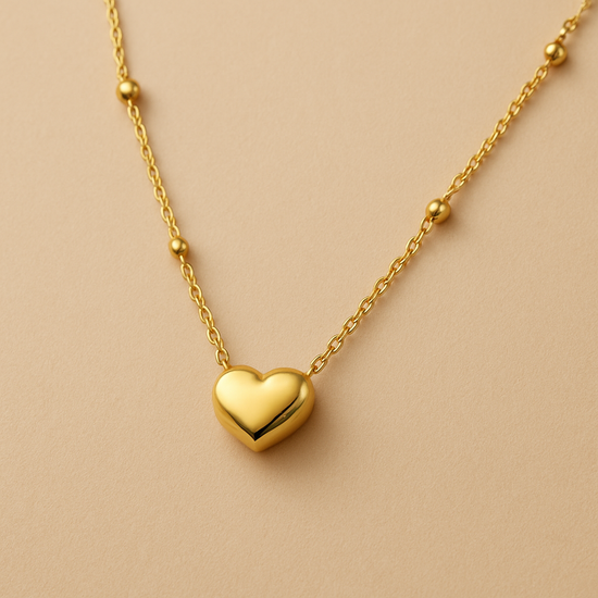 This accessory is a gold plated necklace featuring a polished heart-shaped pendant suspended from a delicate chain adorned with small spherical beads. The pendant’s smooth, rounded form captures and reflects light beautifully, giving it a warm, radiant glow that symbolizes love, elegance, and timeless sentiment.
