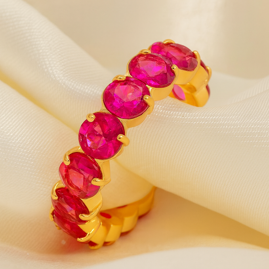 A striking gold-plated ring adorned with a continuous row of vibrant ruby-tone stones, designed to radiate warmth and elegance. Bold yet refined, it brings a rich pop of color and timeless glamour to both everyday wear and special occasions.