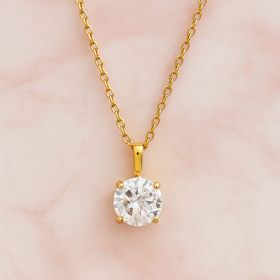 A classic gold-plated necklace featuring a radiant round solitaire stone in a refined prong setting. The Solitaire Glow Necklace captures timeless elegance and effortless sparkle, making it the perfect everyday essential or a graceful accent for special moments.