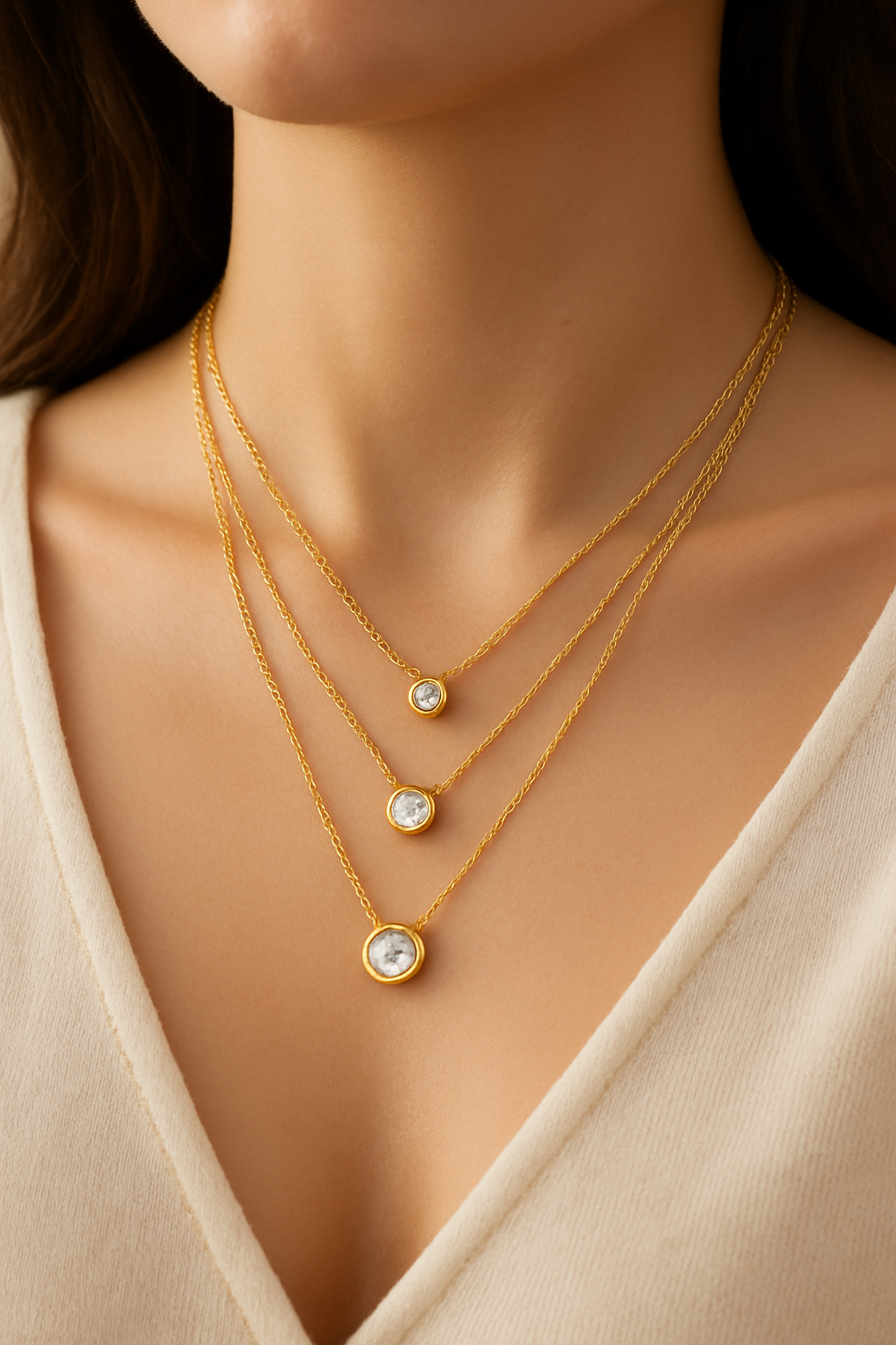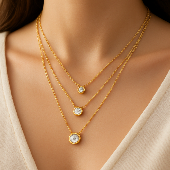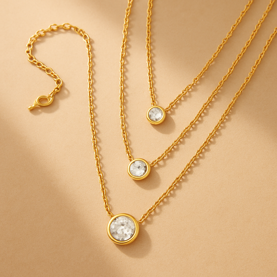 A graceful gold-plated layered necklace featuring three delicate solitaire accents, each resting at a different length. The Trinity Glow Necklace represents harmony, balance, and timeless elegance—perfect for adding effortless sophistication and soft sparkle to any look.